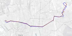 La línea recorre la calle de Alcalá hasta llegar a la Plaza de Toros de Las Ventas, donde gira a la izquierda para circular por la Avenida de los Toreros. Desde esta avenida gira a la derecha para incorporarse a la calle Roberto Domingo, que recorre entera girando al final a la derecha por la Avenida Donostiarra, que también recorre entera pasando sobre la M-30 este.