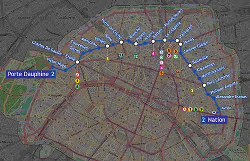 La línea 2 del metro de París es una de las dieciséis líneas que forman la red metropolitana de París. Une la estación de Porte Dauphine con la estación de Nation formando un semicirculo de oeste a este sobre el norte de la ciudad.
