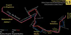 La línea 3 del Transport Urbà de Castelló (TUCS) une la Basílica del Lledó con el Hospital La Magdalena pasando por el Auditorio y Palacio de Congresos, el Grupo San Agustín y San Marcos y cercanías de la Universidad Jaime I.