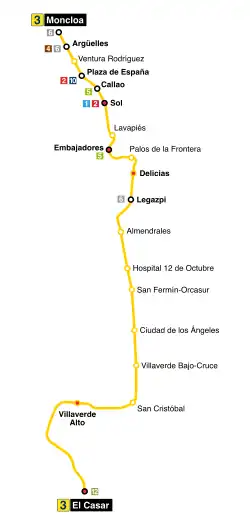 La línea parte de la Plaza de la Moncloa, en el noroeste de la zona central de la ciudad, y viaja hacia el sur bajo la calle de la Princesa, recorriéndola en su totalidad hasta la Plaza de España, desde donde continúa bajo la Gran Vía. En la Plaza del Callao gira para circular bajo la calle de Preciados hasta la Puerta del Sol, desde donde continúa hacia el sur, para recorrer por el subsuelo las calles de Lavapiés, Miguel Servet, y tras pasar bajo el barrio de Embajadores, la calle de Palos de la Frontera y el Paseo de las Delicias. Cruza el río Manzanares bajo el Puente de Andalucía y pasa bajo las avenidas de Córdoba y Andalucía para llegar junto a la estación de Cercanías de Villaverde Alto. Finalmente, discurre paralela a la calle de la Acebeda y cruza bajo la M-45 para llegar a la estación de El Casar. Conecta con: