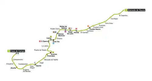 La línea 5 del Metro de Madrid atraviesa la ciudad de Madrid desde el suroeste hasta el nordeste, transcurriendo entre Casa de Campo y Alameda de Osuna, por 32 estaciones con andenes de 90 metros, recorridas por 23,2 km de vías en túnel de gálibo estrecho. Tiene un recorrido que dura aproximadamente 58 minutos entre cabeceras. El tramo entre las estaciones de Eugenia de Montijo y Empalme es superficial.