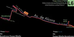 Parte del Paseo Ribalta, pasa por el Hospital Provincial y recorre la Avenida Alcora hasta llegar a Benadresa pasando por el Centro Penitenciario de Castellón y por los distintos grupos que hay en dicha Avenida. Vuelve por el mismo recorrido dando servicio a Benadresa, al Centro Penitenciario y a los grupos de Avenida Alcora para llegar al Hospital Provincial o al Parque Ribalta.