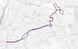 Una vez dentro del viario de Las Cárcavas-San Antonio, la línea circula por el camino de Montoro, la avenida de Maruja Mallo y el Camino del Olivar, donde tiene su cabecera.