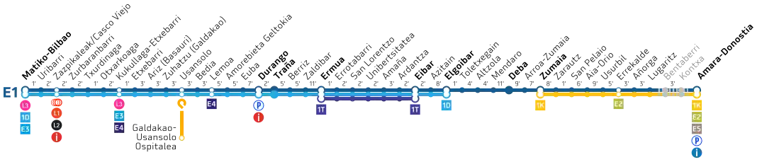 Para reforzar las relaciones entre las poblaciones entre las que los usuarios suelen desplazarse más a menudo, solo una parte de los trenes de la E1 se emplean en trayectos completos de Bilbao a San Sebastián, y viceversa. Así, la mayoría de los trenes realizan viajes más cortos, con lo que los tramos de la línea que transcurren por las áreas metropolitanas de dichas capitales cuentan con mayor frecuencia: