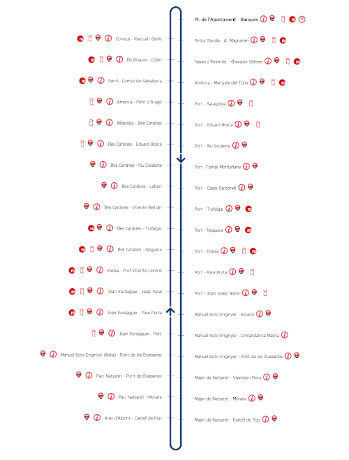 La línea N8 Natzaret - Plaça de l'Ajuntament[1] de EMT de Valencia une el barrio de San Francisco, en el distrito de Ciutat Vella, en pleno centro de Valencia, con el de Nazaret, en el distrito de Poblados Marítimos. Como todas las líneas de la red nocturna de EMT, está considerada como circular, regulando únicamente en la Plaza del Ayuntamiento, cabecera común de las líneas nocturnas, donde se permite el transbordo entre ellas.