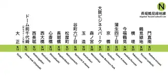 | N16 | Nagahoribashi | 長堀橋 | 3,4 | 34°40′30″N 135°30′23″E / 34.67500, 135.50639 | ||