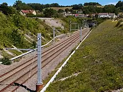 La línea entre Wootton Bassett y Cardiff Central se ha electrificado mediante el sistema aéreo de CA de 25 kV, como parte de la electrificación más amplia de la Línea Principal del Great Western.