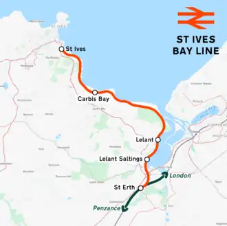 La línea diverge de la Línea Principal de Cornualles en St Erth. Después de que pasa por debajo de dos puentes de una rotonda de la carretera A30 junto a la estación, sigue el lado occidental del estuario pasando por Lelant Saltings. Más allá de la estación de Lelant, la línea entra en un desmonte y remonta las dunas situadas junto a Porth Kidney Sands en St Ives Bay,[7] con el campo de golf de Lelant y la iglesia de St Uny a la izquierda. El cementerio de la iglesia fue afectado cuando el ferrocarril atravesó la colina.[8] El Sendero de la Costa Sudoeste cruza aquí la línea férrea y luego prosigue cerca de la vía hasta St Ives. El ferrocarril continúa subiendo hacia los escarpados acantilados de Hawkes Point, aproximadamente a 30 metros (98,4 pies) sobre el nivel del mar. Poco después, la línea rodea el promontorio en Carrick Gladden y entra en Carbis Bay.[7] Encaramado en la ladera sobre la playa, este complejo solo se desarrolló después de la llegada del ferrocarril en 1877.[8] La línea cruza el viaducto de Carbis (de 78 yardas (71,3 m)) y luego continúa bordeando el acantilado hasta que emerge en Porthminster Point, desde donde desciende a través del viaducto de St Ives (de 106 yardas (96,9 m)) para llegar a la estación de St Ives, que se encuentra sobre la playa de Portminster.[7]