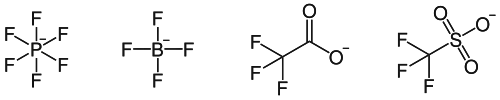 Entre los aniones más usuales se encuentran: PF6-(Hexafluorofosfato), BF4-(Tetrafluoroborato), CF3-COO-(Trifluoroacetato), CF3-SO3-(Trifluorosulfonato o Triflato), SbF6-(Hexafluoro Antimoniato), etc.