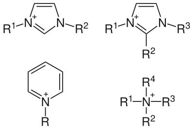 Por lo general, poseen una estructura compuesta por un catión orgánico, que contiene un heteroátomo (N o P), asociado a un anión mineral u orgánico de elevado tamaño, entre los cationes más comunes se destacan: [bmin]+(1-butil-3-metil imidazolio), [hmim]+ (1-hexil-3-metil-imidazolio), [omim]+(1-octil-3-metil-imidazolio), [beim]+ (1-butil-3-etil-imidazolio), [emim]+ (1-etil-3-metil-imidazolio), etc.