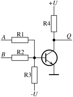 El primer circuito que se utilizó representaba una puerta NO-O NOR en lógica negativa realizada con resistencia y un transistor bipolar de germanio. El principal inconveniente de este circuito es la necesidad de utilizar una alimentación auxiliar para polarizar inversamente la base del transistor cuando todas las entradas del mismo se encuentran en estado cero a fin de reducir la corriente de pérdidas del colector.Este inconveniente se evitó posteriormente mediante la utilización de transistores de silicio.