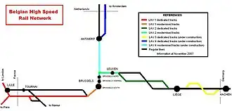 Mapa esquemático de la red belga de alta velocidad a noviembre de 2007.[1] | ||||||||||||||||||||||||||||||||||||||||||||||||||||||||||||||||||||||||||||||||||||||||||||||||||||||||||||