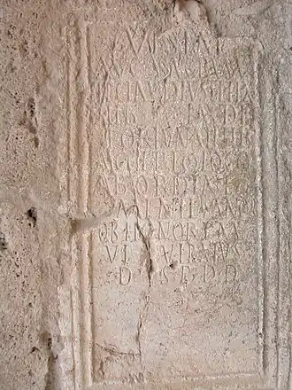 - ↑ ILER 1260; C. M. del Rivero (1933); C. González Román – J. Mangas Manjarrés (1991 [1993]). «Inv. 16776 La Guardia (Jaén). CIL II2/5,4 ( = II 3379 cf. p. 951)». Texto e imagen. Corpus de Inscripciones Latinas de Andalucía III: Jaén, Sevilla (Madrid) 54: 279.