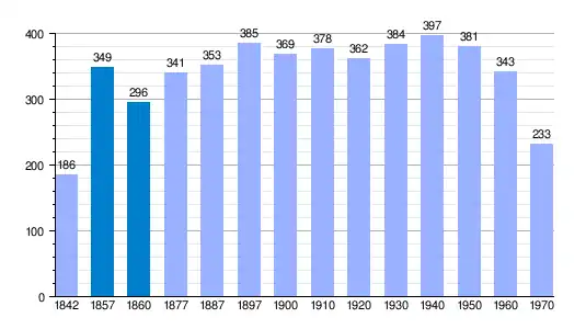 | Gráfica de evolución demográfica de La Herguijuela[7] entre 1842 y 1970 |