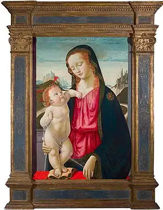 La obra fue realizada a partir de la obra homónima de su hermano Domenico que se encuentra en la Galería Nacional de Londres, Reino Unido, con el número de inventario 3937. Nos muestra a la Virgen vestida en azul y rojo, sosteniendo al Niño apoyado a su vez en un cojín de terciopelo.[1] En la versión de Domenico, un árbol se eleva a la izquierda de la composición en el punto donde termina el sinuoso camino que corre detrás de la Virgen.