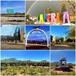 ![]() Desde arriba hacia abajo y en sentido izquierda-derecha: señalamiento de Ojinaga - La Perla, el Letrero de La Perla, iglesia frente a la Plaza Pública, el Arco de La Perla, calle abandonada, vista panorámica del pueblo, y la Ermita de La Perla.