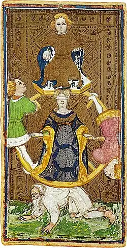- El elemento central es una rueda o rueda de la fortuna, donde un mono sube y otro baja, o bien, un hombre con cabeza de lobo es el que sube y una serpiente es la que baja. Representan, respectivamente, dos de los tres estados de Suerte: Progreso (el que sube) y decadencia (el que baja).