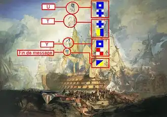• En la pintura se puede ver las tres últimas letras del famoso mensaje que Horatio Nelson, antes de entrar en combate, envío a todas sus naves por medio de un código de banderas (11:50); England expects that every man will do his duty (Inglaterra espera que cada hombre cumpla con su deber). Turner muestra el mensaje en el palo mayor cuando en realidad esos mensajes se izaban en el palo de mesana. Además, nada más que se entabló el combate, la señal fue reemplazada casi inmediatamente por el mensaje: engage the enemy more closely («Enfrentarse al enemigo más de cerca»)