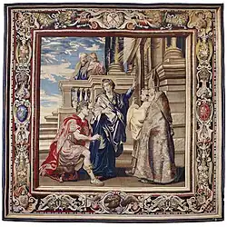 Este tapiz ilustra las concesiones en materia de impuestos instituidas por Constantino en favor de la Iglesia cristiana.[6]