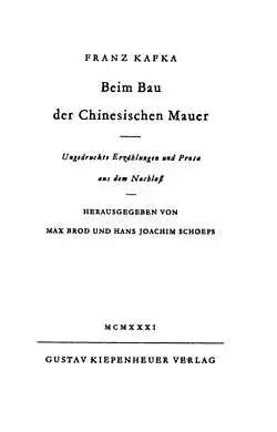 En 1931, el amigo de Kafka, Max Brod, publicó el primer volumen de la prosa de Kafka bajo el título Durante la construcción de la muralla china.[1]