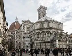 - El Baptisterio de San Juan de la Catedral de Florencia, famosa por tener tres puertas de bronce hechas por Lorenzo Ghiberti (puertas norte y este) y por Andrea Pisano. La puerta del este es conocida como la Puerta del Paraíso y representa diez escenas del Antiguo Testamento