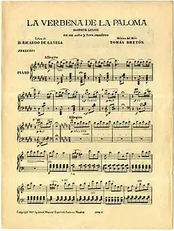 La verbena de la Paloma —subtitulada El boticario y las chulapas y celos mal reprimidos—[1] es un sainete lírico en prosa con libreto de Ricardo de la Vega y música de Tomás Bretón,[2][a] que se estrenó el 17 de febrero de 1894 en el Teatro Apolo de Madrid.[2] Su título hace referencia a las fiestas madrileñas en torno al 15 de agosto, cuando se celebra la procesión de la Virgen de la Paloma.[3]