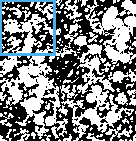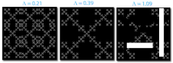 Las mismas imágenes de arriba, rotadas 90°. Mientras que las dos primeras imágenes se ven esencialmente igual que arriba, la tercera se ve diferente de su original no rotado. Esta característica se captura en las medidas de lacunaridad listadas en la parte superior de las figuras, calculadas usando software estándar de contaje de cajas en imágenes biológicas FracLac,, Imagen.