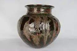 Ladi Kwali (16 de marzo de 1925-12 de agosto de 1984)[1] fue una ceramista nigeriana, distinguida con la Orden del Níger y miembro de la Orden del Imperio Británico. Ladi Kwali nació en el pueblo de Kwali en la región de Gwari, al norte de Nigeria, donde la alfarería era una ocupación entre las mujeres nativas.[2] Aprendió a hacer cerámica de niña de la mano de su tía, utilizando la técnica tradicional del urdido. Hacía grandes cántaros para el agua, ollas de cocina, cuencos y frascos con rollos de arcilla, golpeados desde el interior con una paleta plana de madera. Los decoraba con estilizados motivos geométricos y figurativos incisos como escorpiones, lagartos, cocodrilos, camaleones, serpientes, pájaros y peces.[3] Imprimía los dibujos en la parte superior de las figuras haciendo rodar pequeñas ruletas de cuerda retorcida o madera con muescas sobre la superficie de la arcilla, unas veces como bandas horizontales y otras en paneles verticales.[4] Las ruletas consistían en pequeños cilindros de madera dura, de dos o tres pulgadas de largo y media pulgada de diámetro, con muescas en patrones rectos, oblicuos o paralelos.[5] Las vasijas de barro y las técnicas decorativas se remontan al período neolítico.[5] Siguiendo el método tradicional de la región, se cocían en una hoguera de vegetación seca. Sus vasijas destacaban por la belleza de sus formas y decoración, y fue reconocida regionalmente como una alfarera eminente y talentosa.[6] Algunos de sus trabajos fueron adquiridos por el emir de Abuya, Alhaji Suleiman Barau,[7] en cuya casa las vio Michael Cardew en 1950.