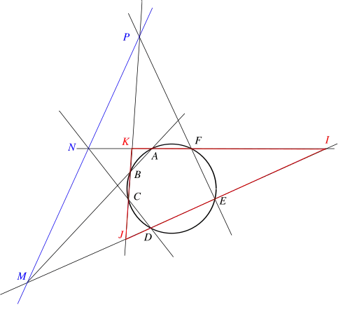 El teorema de Pascal establece que si se eligen seis puntos arbitrarios en una sección cónica (es decir, elipse, parábola o hipérbola) y se unen por segmentos de línea en cualquier orden para formar un hexágono, entonces los tres pares de lados opuestos del hexágono (extendido si es necesario) se encuentran en tres puntos que se sitúan en una línea recta, llamada recta de Pascal del hexágono.