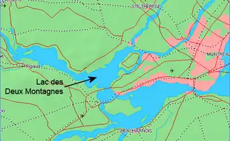 El lago de las Dos Montañas[1] (del francés: lac des Deux Montagnes) es un lago de aproximadamente 150 km², localizado en el suroeste de Quebec (Canadá), al noroeste de la isla de Montreal y de la isla Jesús (Laval), en el área del delta fluvial de la confluencia del río Ottawa en el río San Lorenzo. El lago de las Dos Montañas tiene cuatro salidas que acaban todas en el río San Lorenzo: dos brazos del río Ottawa —a ambos lados de la isla Perrot y que desembocan en el San Lorenzo en el tramo del lago Saint-Louis— y la rivière des Mille Îles y la rivière des Prairies —que bordean la isla Jesús—. El lago corresponde aproximadamente con la superficie de agua localizada entre la presa de Carillon, en el río Ottawa, y la de Grand Moulin, en el rivière des Mille Îles.