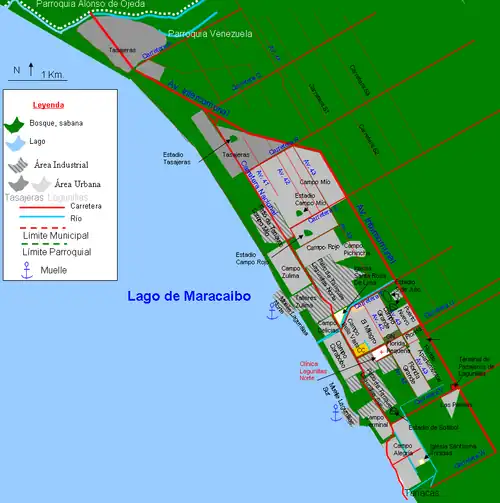 Lagunillas se encuentra entre Ciudad Ojeda al norte y Bachaquero al sur, abarcando desde la carretera R hasta la carretera W.