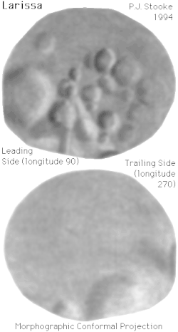 Larisa presenta un aspecto notablemente irregular y no muestra signos de actividad geológica; su superficie muestra una gran densidad de cráteres.