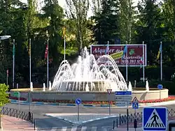 - Carretera de Las Rozas a Majadahonda (antigua carretera M-515). Esta arteria de Las Rozas empieza la rotonda que hace esquina con el final de la calle Real y conecta con el final de la avenida de los Reyes Católicos (Majadahonda). En concreto, con el número 15 en la acera de los impares, donde se encuentra el Centro Emisor de RTVE,[11] y el número 18 en el lado de los pares. Esto se debe a que en la localidad majariega la dirección de los números va en sentido contrario ya que la avenida comienza en la rotonda que hace esquina con la calle Doctor Calero para ir en sentido norte. Por otra parte, a 15 metros de la puerta de acceso al recinto de RTVE, se encuentra un monoposte tricara de 6 metros de altura del Ayuntamiento de Majadahonda que indica la entrada al municipio majariego. El cartel principal visto desde Las Rozas anuncia lo siguiente: «Bienvenido a Majadahonda. Donde tú vives».