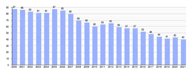 | Gráfica de evolución demográfica de Las Vegas de Yeres[4] entre 2000 y 2021 |