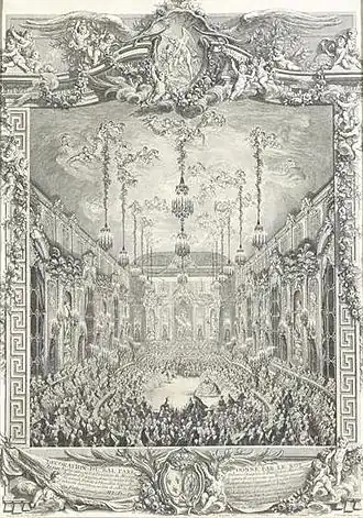 Decoración del baile dado por el rey el 24 de febrero de 1745, con ocasión del primer matrimonio del Delfín, en la misma sala construida en el picadero cubierto de la Grande Écurie (con dirección de M. de Bonneval) ¿1745?, Charles Nicolas COCHIN le Jeune (h. 1715-1790).