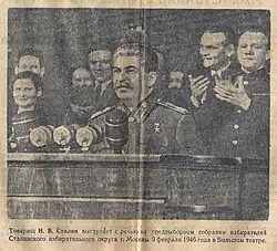 Iósif Stalin, Secretario General y líder de facto de la Unión Soviética, habló en el Teatro Bolshoi el 9 de febrero de 1946, la noche antes de las elecciones legislativas de dicho año. El discurso no discutió la política exterior, sino que prometió expandir la industria. Justificó la expansión señalando la teoría del marxismo-leninismo que advirtió que el capitalismo poseía una predisposición al conflicto.[5]