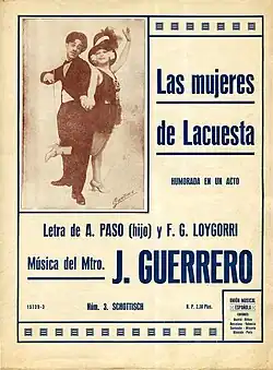 - ↑ Partitura de Las mujeres de Lacuesta, 1926. Unión Musical. Madrid, Carrera de San Jerónimo, 30.