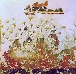 - ↑ a b c Gerasimoula Ioanna Nikolovieni (2003): Δράση και χώρος στις αιγαιακές τοιχογραφίε, pp.12-13, Universidad de Tesalia (en griego)