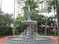 Originalmente se colocó una fuente de hierro fundido en el centro del mercado, bajo la torre del reloj, pero en 1902 la fuente se trasladó a la parte delantera del ahora demolido Mercado de Orchard Road.[11] La fuente fue trasladada de nuevo en 1930 al Grand Hotel en Katong,[12] y posteriormente fue desmantelada y olvidada. Fue redescubierta en piezas en 1989 por un equipo responsable de las obras de restauración del Hotel Raffles. Desde entonces, la fuente se ha vuelto a montar y restaurar, y ahora constituye la pieza central del Jardín de Palmeras del Hotel Raffles.[11][13]