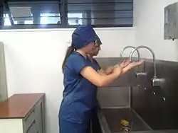 En la preparación de una intervención quirúrgica se lavan las manos, muñecas y antebrazos con el propósito de eliminar al máximo tanto la flora transitoria como la residente. Se practica antes de una técnica invasiva que requiera un alto grado de asepsia quirúrgica. Del mismo modo, es necesario instalar lavabos con cierre automático (sistema de codo o pedal).[22]