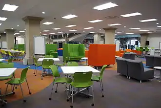 Los espacios nuevos o renovados de la biblioteca se les da comúnmente un nuevo propósito para reunir a los estudiantes para trabajar, estudiar y socializar. Los Learning Commons normalmente ofrecen un amueblado cómodo tanto para el individuo como para el grupo de estudio, el amueblado en partes permite a los usuarios personalizar el ambiente para adaptarse a sus necesidades, acceder a la red inalámbrica y tomas de corriente, laboratorios y soporte multimedia y a menudo una cafetería con pocas restricciones de comida y bebida. Los Learning Commons buscan expandir e integrar las opciones reales y virtuales que tienen los estudiantes para compartir sus experiencias. Ambientes seguros, inclusivos y amigables por toda la escuela son imprescindibles para satisfacer a los individuos, equipos y grupos con distintas habilidades y estilos de aprendizaje. Los espacios de aprendizaje virtual aumentan este potencial.