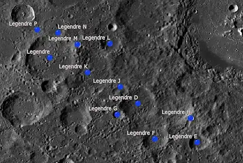 Por convención estos elementos son identificados en los mapas lunares poniendo la letra en el lado del punto medio del cráter que está más cerca de Legendre.