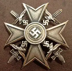 La Cruz española (Spanienkreuz) fue la condecoración entregada a los veteranos de la Legión Cóndor por las autoridades nazis desde el 14 de abril de 1939. Debido a la naturaleza secreta de las actividades alemanas en España durante la guerra, hasta entonces no había sido entregada ninguna condecoración oficial por parte de las autoridades militares alemanas, aunque algunos militares alemanes habían recibido condecoraciones por parte de las autoridades franquistas en agradecimiento a sus servicios durante algunas operaciones militares. Durante el desfile de la Victoria celebrado el 19 de mayo en Madrid participaron algunos miembros de la Legión Cóndor, al igual que en la concentración aérea que tuvo lugar en el aeropuerto de Barajas el día 12 del mismo mes. El 22 de mayo tuvieron una fastuosa despedida (la noche anterior se celebró un desfile de antorchas) en el aeródromo de La Virgen del Camino, donde marcharon cinco mil legionarios hasta terminar en la catedral de León, con la asistencia de personalidades como el jefe del Ejército del Aire Alfredo Kindelán o el obispo Carmelo Ballester.[16] Presidió los actos el ya dictador Franco, que agradeció la ayuda de las legiones alemanas para derrotar a «la escoria comunista de Europa»[17] en territorio español y recalcó así su importancia decisiva para la victoria:[18]