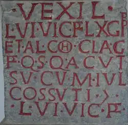 - CIL XIII 7697: ---] Her[c]u[li Sax(ano?)] / vexillari(i) / [l(egionis) I M(inerviae)] P(iae) F(idelis) l(egionis) VI Vic(tricis) P(iae) F(idelis) / l(egionis) X G(eminae) P(iae) F(idelis) et al(arum) coh(ortium) / cl(assis) q(uae) s(ub) Q(uinto) Acut(io) / [s]u(b) [cu(r)a] M(arci) Iu[l]i / Cossuti |(centurionis) l(egionis) VI / Vic(tricis) P(iae) [F(idelis)]