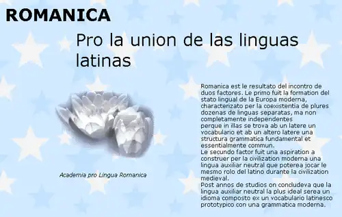 Bono di'a, i benvenido al Projeto Romanova! Si tu pode leser esto tecsto, donse la lingua nova ce nus clama Romanova sta funsionando multo bien! Nus ave produsido esta lingua con la speransa ce todos los parladores de las linguas roma'nicas modernas podera' comunicar eficasemente entre se. La lingua nova consiste de tres mil vocablos, mas o menos, i elo fu formado di vocablos prendidos di todas las cuatro linguas roma'nicas maiores: el espaniese, el fransiese, el italiese, i el portugalese.[61]