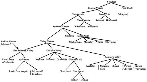 Algunas de las primeras clasificaciones dividían a la familia yokuts en 3 grupos principales cada uno de los cuales a su vez constaba de numerosas lenguas, dialectos y subdialectos. La siguiente clasificación aparece en Mithun (1999) y se basa en Whistler & Golla (1986) y Gamble (1987).