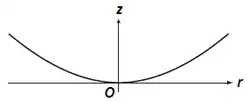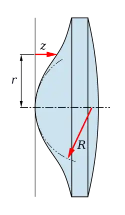 La flecha de una lente asférica como una función de la distancia al eje óptico r depende de dos parámetros: el radio de curvatura R (o curvatura C = 1 / R) y la conicidad K .[2]