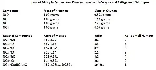 Esta ley afirma que cuando dos elementos se combinan para originar distintos compuestos, se combinan con dicha cantidad fija para dar como producto los compuestos, están en relación de números enteros sencillos. Esta fue la última de las leyes ponderales en postularse. Dalton trabajó en un fenómeno del que Proust no se había percatado. Así, por ejemplo, hay dos óxidos de cobre, el CuO y el Cu2O, 79,89 % y un 88,82 % de cobre, respectivamente, y que equivalen a 3,974 gramos de cobre por gramo de oxígeno en el primer caso y 7,948 gramos de cobre por gramo de oxígeno en el segundo. La relación entre ambas cantidades es de 1:2 como se expresa actualmente con las fórmulas de los compuestos derivados de la teoría atómica.