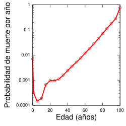 La ley de mortalidad de Gompertz-Makeham describe la relación de la edad con la mortalidad humana con bastante precisión en la ventana de edad de aproximadamente 30 a 80 años. En edades más avanzadas, algunos estudios han encontrado que las tasas de mortalidad aumentan más lentamente, un fenómeno conocido como desaceleración de la mortalidad en la vejez,[2] aunque estudios más recientes no están de acuerdo.[4]