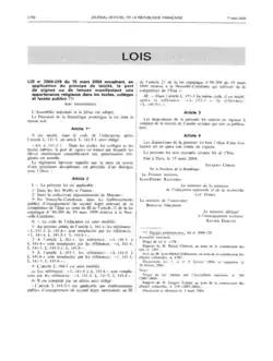 Esta ley prohíbe llevar símbolos "ostensibles" (es decir, visibles y llevados con la intención de que sean vistos) de pertenencia a una religión. Entre los artículos prohibidos por esta ley se encontrarían el hijab musulmán, la kipá judía, el turbante sij y grandes cruces cristianas. Siempre se permite, por otra parte, llevar símbolos discretos como pequeñas cruces, estrellas de David y manos de Fátima. La ley anterior dejaba la decisión en manos del director de cada colegio público.